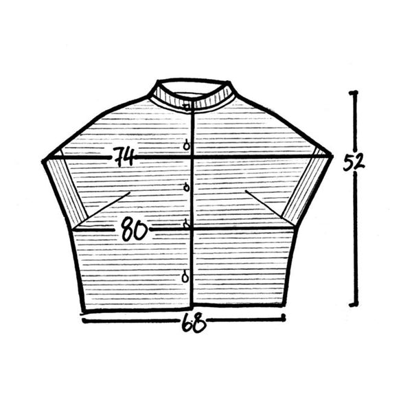 Måtten på bilden är mätta i cm och på bilden kan du se hela längden, bredden och halva bröstvidden.